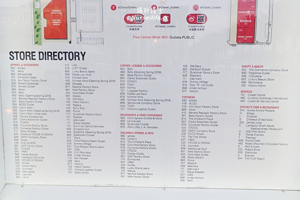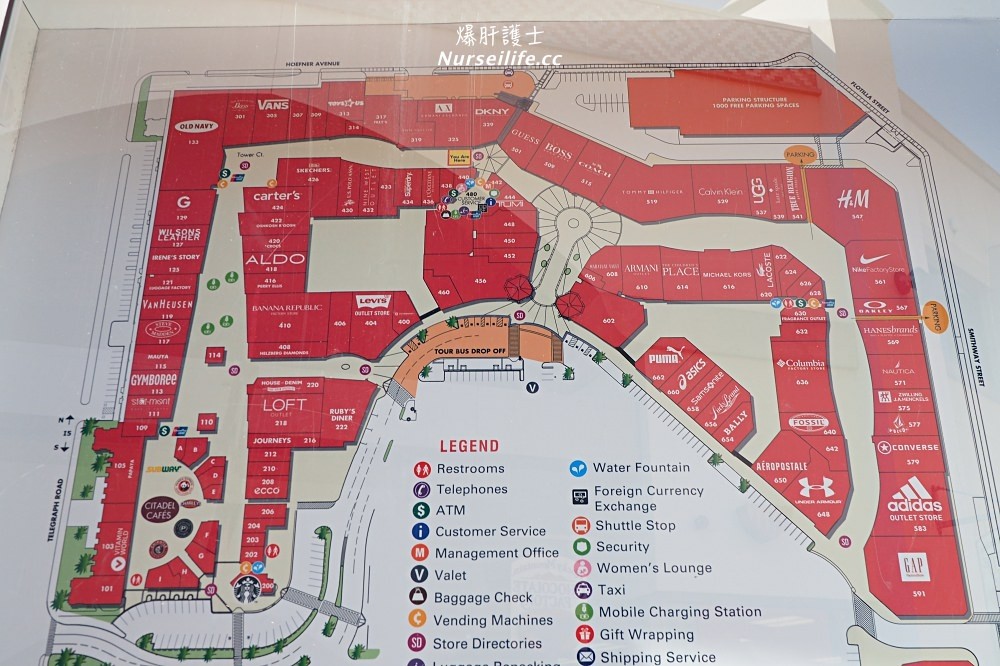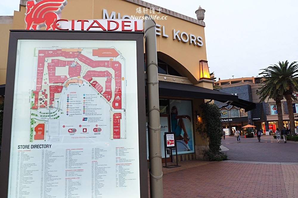 今天要介紹給大家的凹累是位在洛杉磯的Citadel Outlets,光看這一張地圖,大家就可以知道,腿力不好、臂力不好,你會哭,沒有網路沒關係,賣場有提供Wi-Fi,你要注意的就是別搶輸人就好!搶輸人?對,這裡因為太有名,很多旅行社都會開車把遊客載來這裡,然後對岸同胞是十個包、十雙鞋這樣搶的,你是一個恍神,東西就在你眼前消失了。