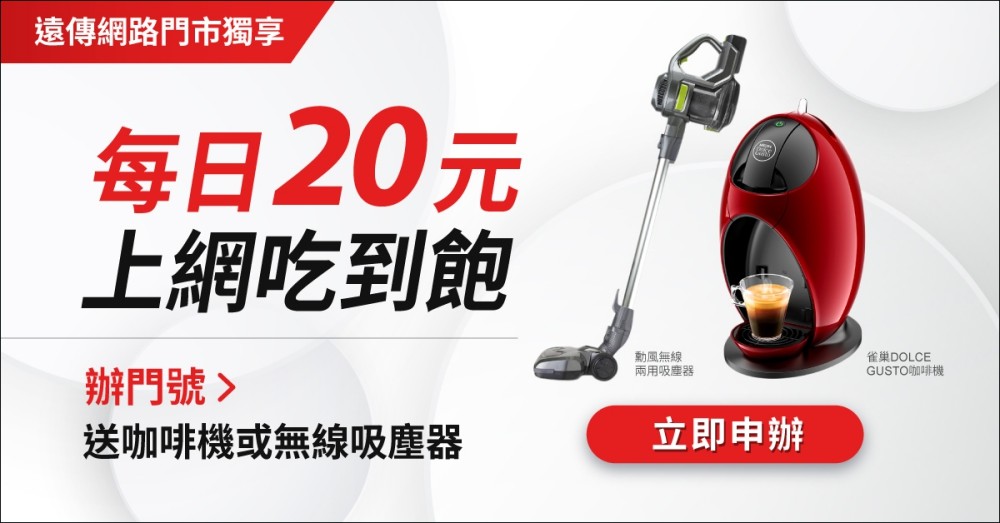 即日起到6月底來遠傳「網路門市」攜碼、新申辦,月付$499上網吃到飽不限速,加抽日韓機票。如果想要輕鬆帶走家電又不想花大錢?日付20元上網吃到飽,即可將市價近$7,000元的無線吸塵器$0元帶回家,還有膠囊咖啡機及行李箱任你挑。