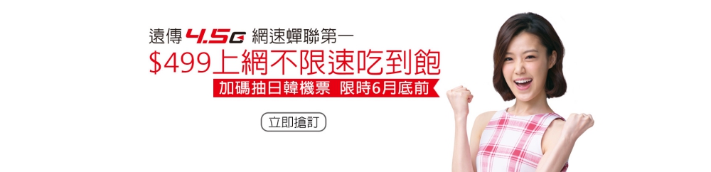 錯過499超值優惠方案正在懊惱嗎? 遠傳網路門市提供最後機會,6月底前攜碼及新申辦只要月付$499,即享4.5G超極速上網吃到飽,網內互打通通不用錢,加碼再抽$8,000元出國旅遊金,可換日韓機票立即出國享樂趣!遠傳網路門市限定超值資費,千萬別錯過!詳情請見活動網站: http://遠傳官網.tw/544jDb。