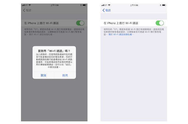 當電信商名稱從「GT」變成「GT WiFi」,代表開始使用 WiFi 通話功能。