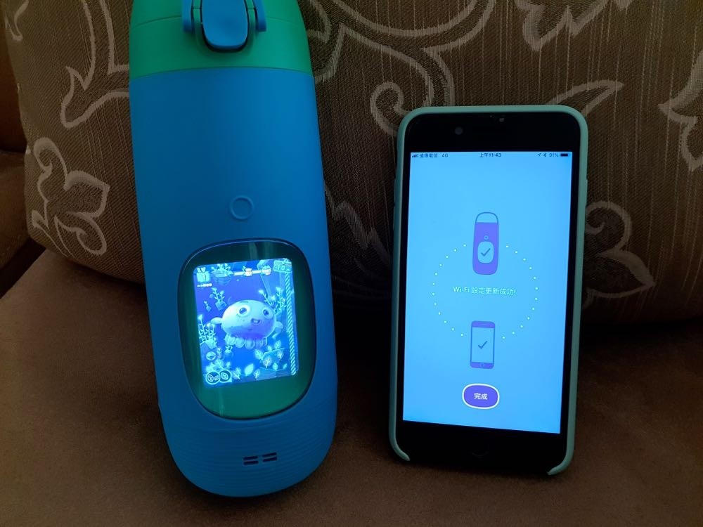 這邊先簡單提一下設定時要讓水壺和手機都在 WiFi 的環境下,設定完成後就不用手機了,水壺只要回到 WiFi 環境下充電,飲水紀錄和遊戲進度就會與 app 同步!