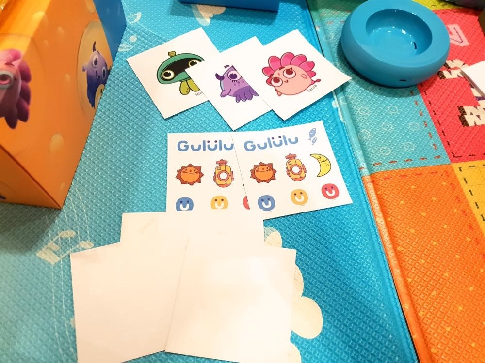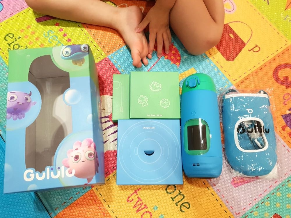 Gululu Talk 共有巨鯨藍、珊瑚粉、潛水艇黃三種顏色可以選擇,盒裝中不僅有著充電線、說明書,還有對應水壺顏色的無線充電盤跟 Gululu 小精靈們的可愛貼紙、精美繪本,拉近與小朋友之間的距離。