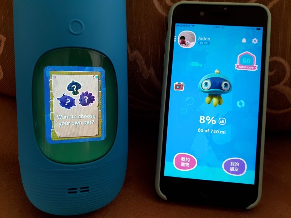 在水壺本身的操作上,小朋友和家長可以從水壺兩側上、下滑動來和小精靈互動,累積水量喝得越多,小精靈等級就會提升,等級越高、能獲得的鑽石也越多,這些鑽石就能讓小朋友進入商店購買替換的裝扮,打扮一下。