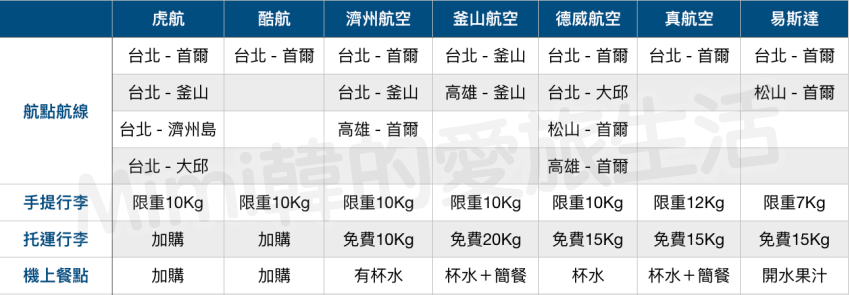 以下就把這幾家飛韓國的廉航包含各家的航點航線、托運行李、手提行李和機上餐點等資訊簡單整理,只能說韓國籍LCC都好佛心,除了給水給餐點,甚至還有10~20Kg的免費托運行李扣打,完全就適合要去韓國掃貨的朋友。另外每家航空公司也都會不定時推出優惠搶票活動,記得關注一下他們的粉絲團。