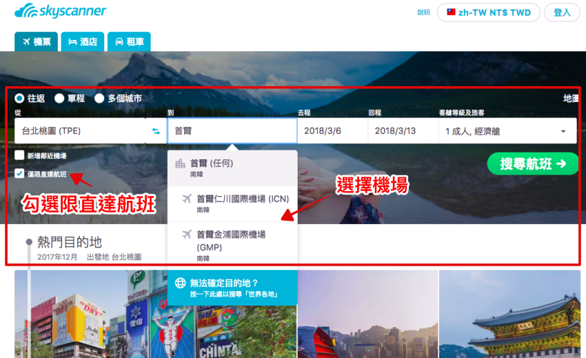 如果我們要找便宜的韓國機票,就直接在Skyscanner開始輸入出發地點/目的地/去程時間/回程時間/客艙/旅客人數等資訊,另外亞洲的國家我會直接勾選”僅限直達航班”,最後點選搜尋航班即可。