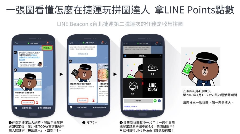 LINE 持續積極拓展線上線下的串連與應用,今 (4) 日更宣布繼續攜手台北捷運,將 LINE Beacon 佈建擴增至 35 個捷運站點,要讓 LINE 用戶在台北捷運大玩「拼圖達人」的收集任務,2018 年 6 月 4 日 00:00 至 2018 年 7 月 1 日 23:59 共四週的活動期間,在指定捷運站入站時開啟手機藍牙與 GPS 定位,在 LINE TODAY 官方帳號中輸入關鍵字「拼圖達人」,就有機會在 LINE 中接收到拼圖方塊。集滿單週指定拼圖,就可以獲得 LINE Points 3 點的獎勵資格,四週全勤者還可再抽 LINE Points 888 點等加碼獎勵。