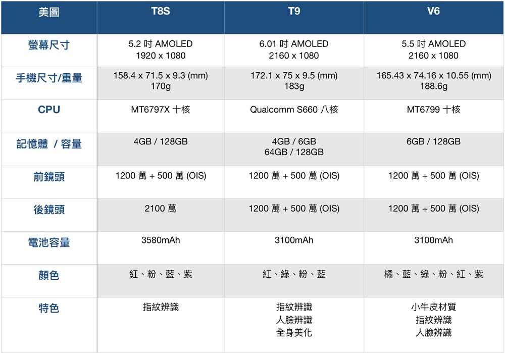 我們可以發現 T9 其實可以說是延續了 V6 的四鏡頭特色,並且在軟體上加入修身效果,當然更不用說T9 也是美圖首次採用高通處理器的機種。