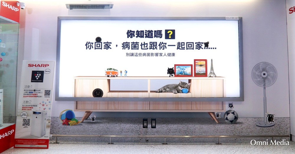 從一開始創意發想、場域地點選擇、互動體驗的呈現形式,讓廣豐國際的專業團隊煞費苦心,也全賴於台灣夏普對於品牌精神的完整傳達、產品特色的表現擁有許多期待與嘗試,最後選定於國家大門第一站-桃園機場第一航廈內的桃園捷運A12站必經連通道首創設置「自動除菌離子空清屋」,從捷運站出入通道往返機場必經燈箱前為核心,擴展為通道間的展示區域,透明的半密閉空間完全無壓迫感,更能在地面加置高度以便展示品牌系列商品、踏入通道便能觸動感應器、喇叭傳來「5、4、3、2、1開始除菌囉!」