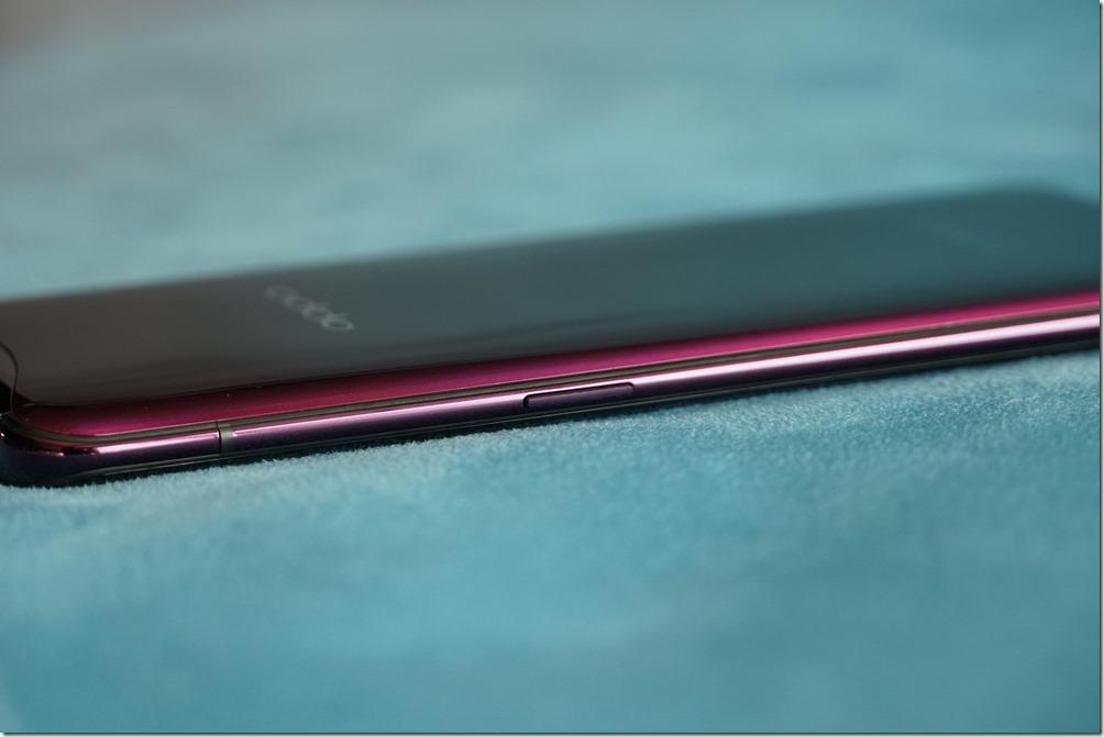 機身背面一樣以雙曲面設計,以漸層方式往兩側擴散,無論是波爾多紅或是冰珀藍都非常亮眼。實際握在手中感到很薄,並沒有因為加入了自動伸縮相機模組而有厚重的手感。