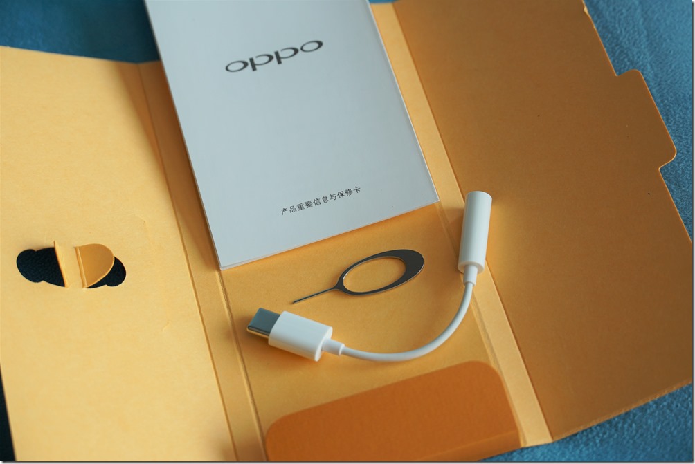 上層配件盒中包含了退卡針、TYPE C 耳機轉接線與說明書。手上版本是沒有包含保護殼,但看上盒的空間設計中應該出廠時會包含保護殼,台灣官方目前確定出貨時會有保護殼。對了,會附上耳機轉接線就表示,FIND X 是沒有 3.5mm 耳機孔設計。