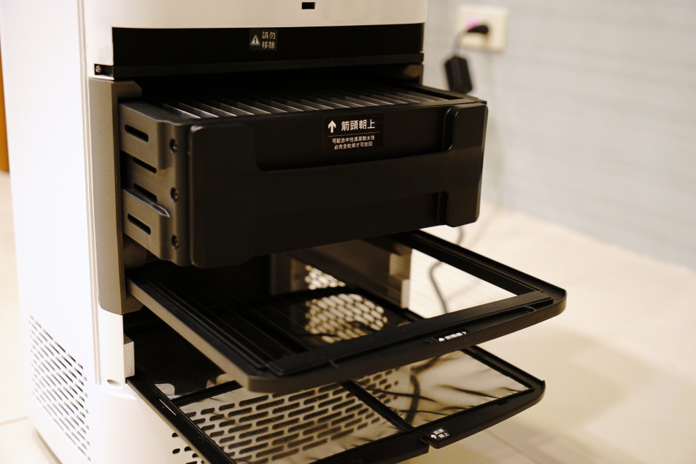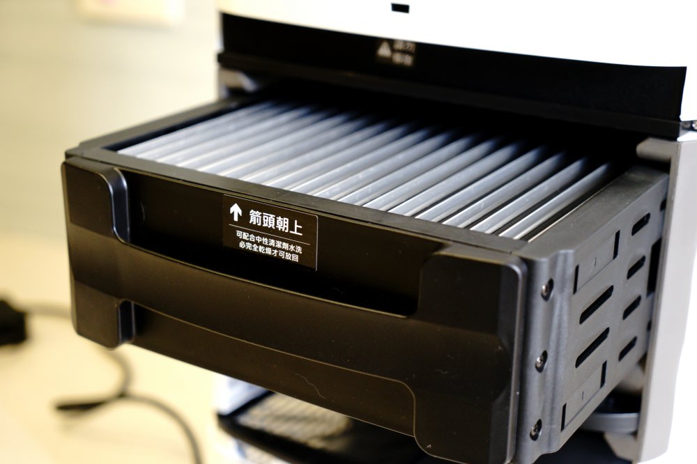 清潔收集器也很簡單,只要關閉電源後拿出來,放到容器裡面,使用中性清潔劑浸泡並使用清潔刷刷洗金屬片即可。清洗完之後一定要把收集器晾乾,至少靜置48小時才可以放回機器裡面。