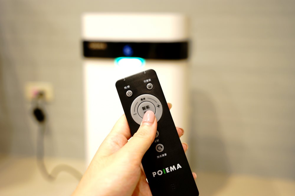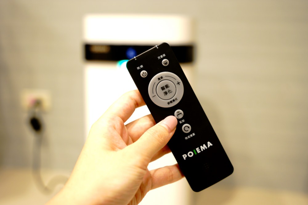 POIEMA 免耗材空氣清淨機遙控器遙控也非常的方便,家裡有小朋友時,只要用遙控器按下「兒童鎖」就不會因為孩子去按開關機鍵而影響機器運轉了。也能直接利用遙控器來開關機、控制風速。