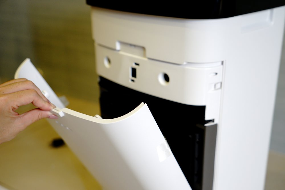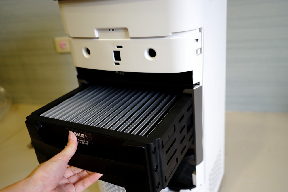 機器上面都有寫如何放入,說明書也都很清楚,只要依照指示方向插入機台內,不需要任何的工具輔助。接著將後蓋蓋起來,把空氣清淨機放到家中要放置的位置,記得進風口和牆壁距離最好大於50公分。擺好之後就可以插電開始啟用囉!