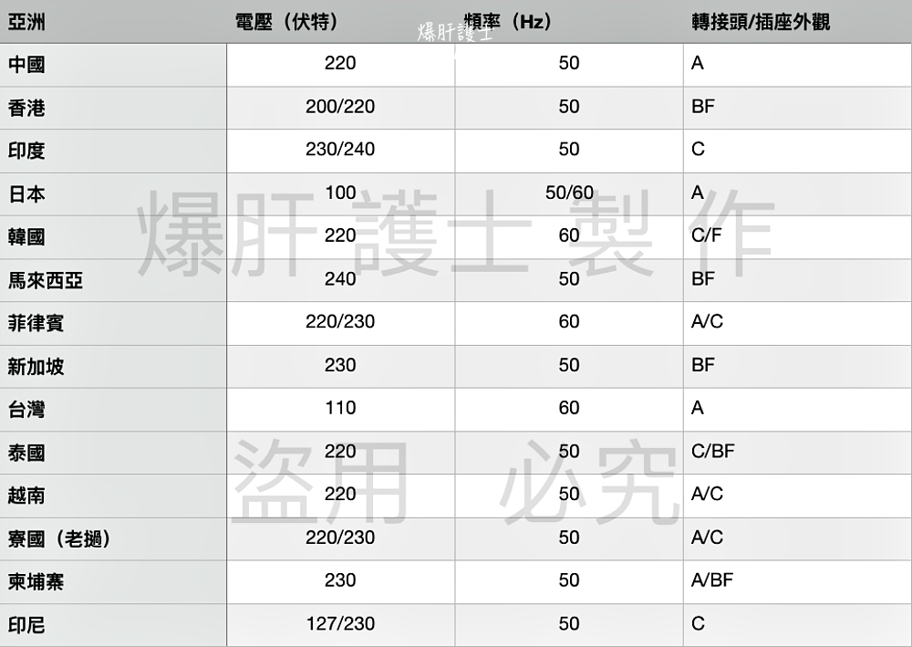 亞洲地區的電壓及轉接頭