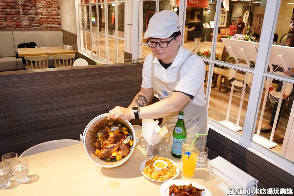 小米嚐用的是B餐BIGGER Catch(3680元),有活龍蝦.甜白蝦.魷魚.蛤蜊.淡菜.小章魚.奶油蔥香麵包.送配菜X4,配菜有甜玉米.花椰菜.美式香腸.杏鮑菇可以每樣選一種或重複選。