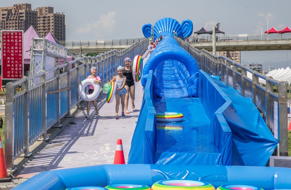 不過,帶著小朋友到海邊或是游泳池,其實遠比想像中麻煩不少,再加上交通未必方便又人擠人,相對未必是個很棒的選擇。如果要找個兩全其美的方式,熊倒是會推薦這次搶先體驗位於新月橋新莊側新月廣場的2018新北市新月水道節。