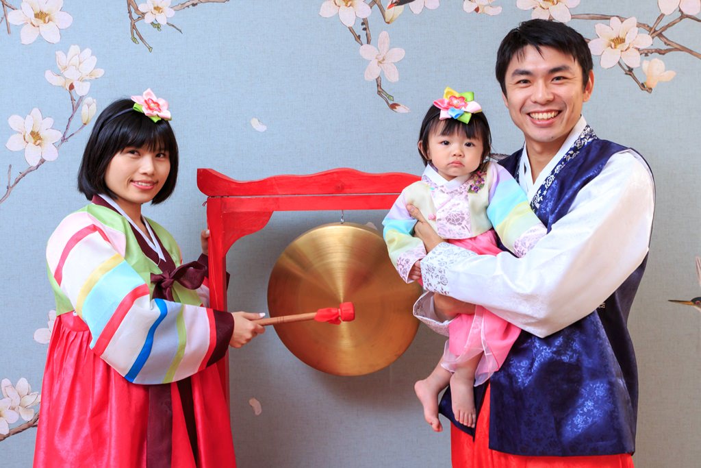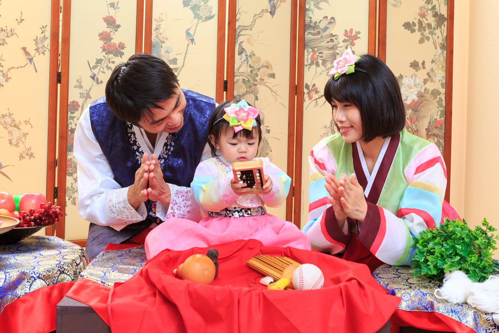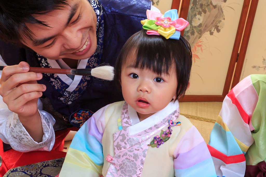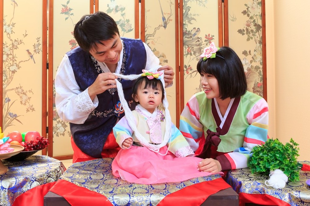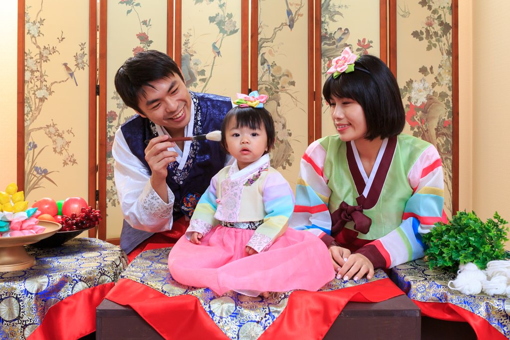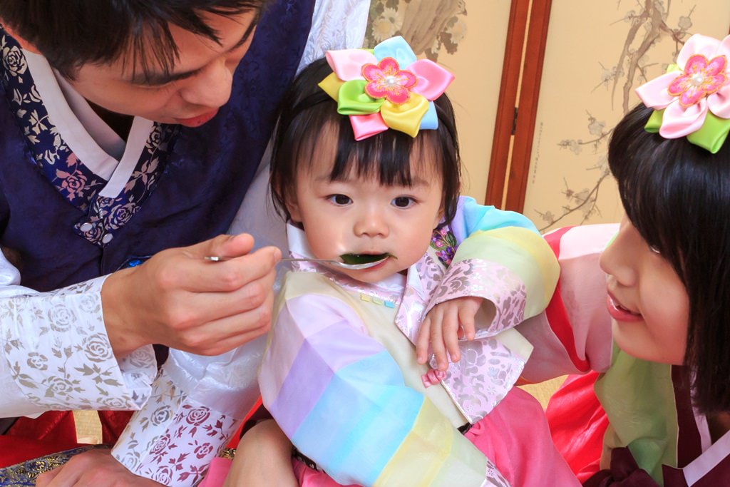 韓國傳統儀式,長線即麵線,在中國或韓國麵線的意義都有延年益壽的含意,掛長線象徵期許孩子長命百歲。