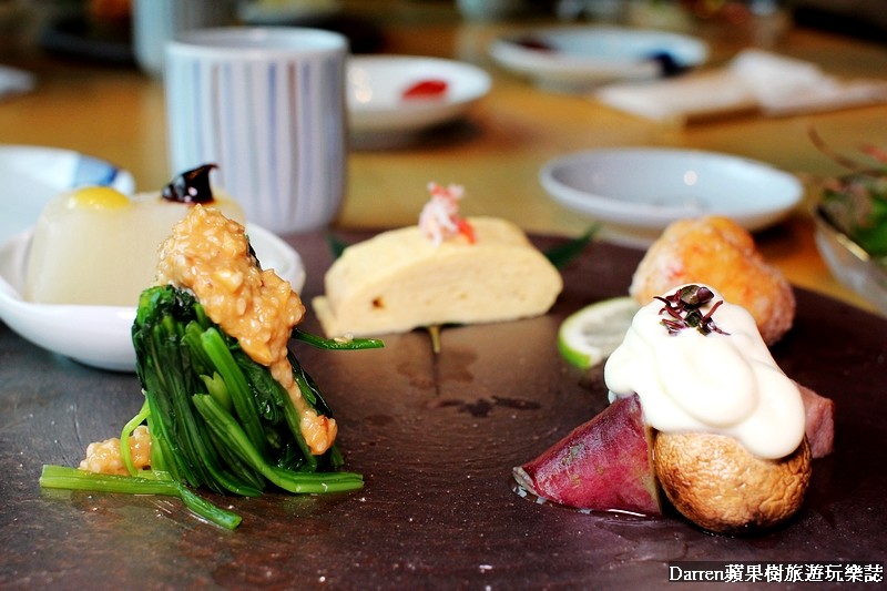 季節前菜5品會不定期更換,這天提是蕎麥屋出汁玉子燒松葉蟹、燉煮蘿蔔味噌田樂、蔬菜佐胡麻腰果醬等五品