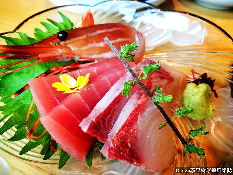 季節生魚片3品有牡丹蝦、紅魽、鮪魚等,加上食用花卉,光是擺盤配色超美,就讓我忍不住多按幾下快門