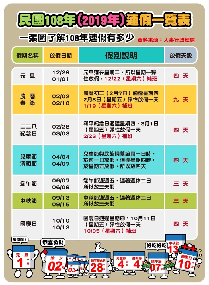 108年(2019)超過三天的連假總共有七個,大家可以開始安排,開始計畫囉!