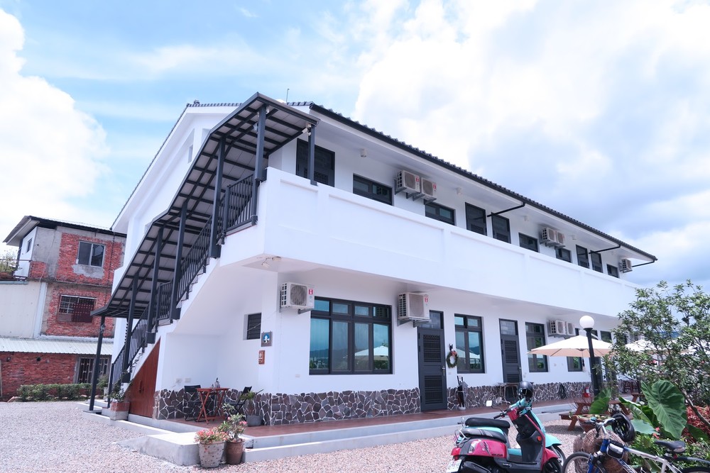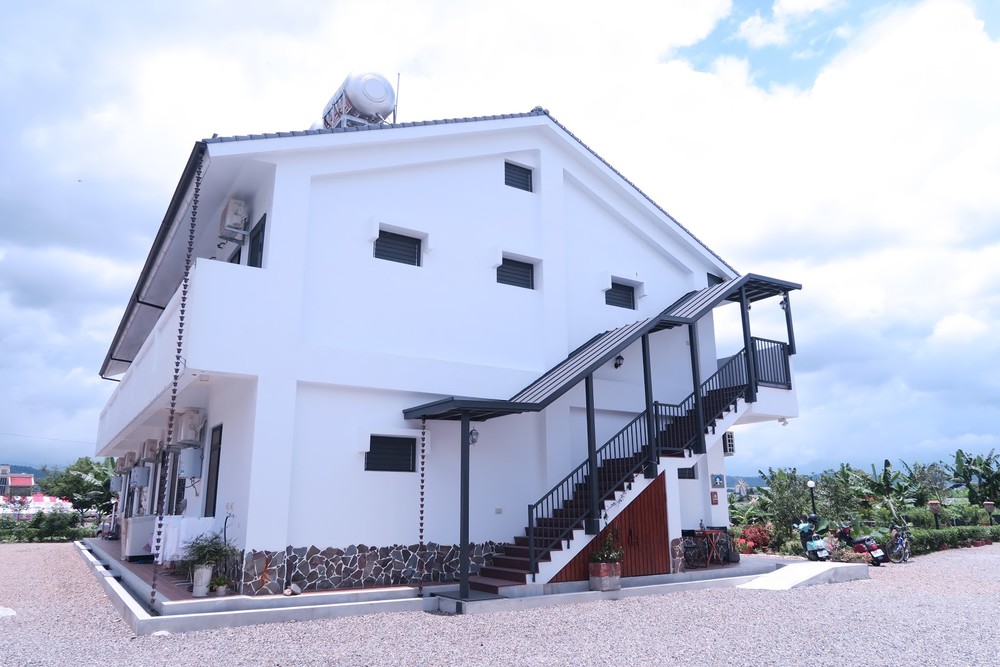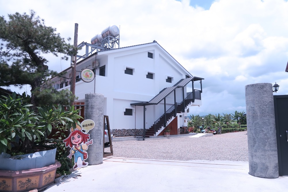 民宿外觀是簡單乾淨的斜屋頂建築,四周有許多盆栽植物佈置,接待區(餐廳)在一樓,客房的話一、二樓都有。