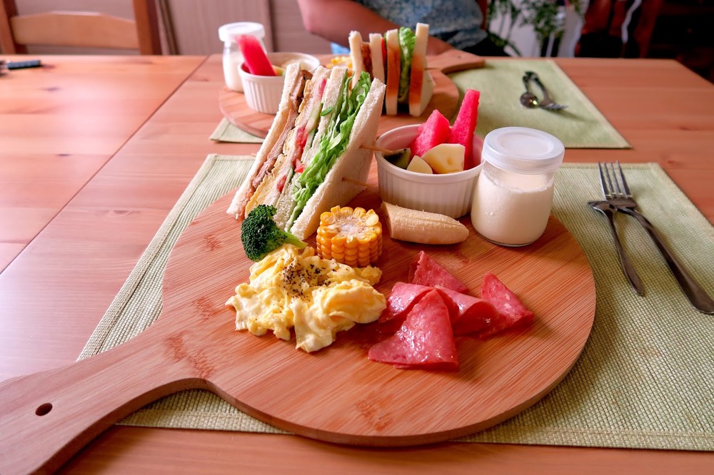 主餐是超厚里肌總匯三明治,配菜有火腿、炒蛋、蔬菜、水果們,以及點心是奶酪!三明治大到連大軒一口咬都很勉強XDD 而且清爽美味!這樣一份在台北富錦街大概賣300元吧!早餐能吃的兼具營養、美味、美觀,真的很幸福啊!