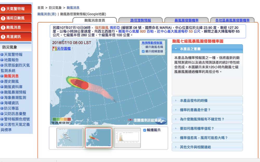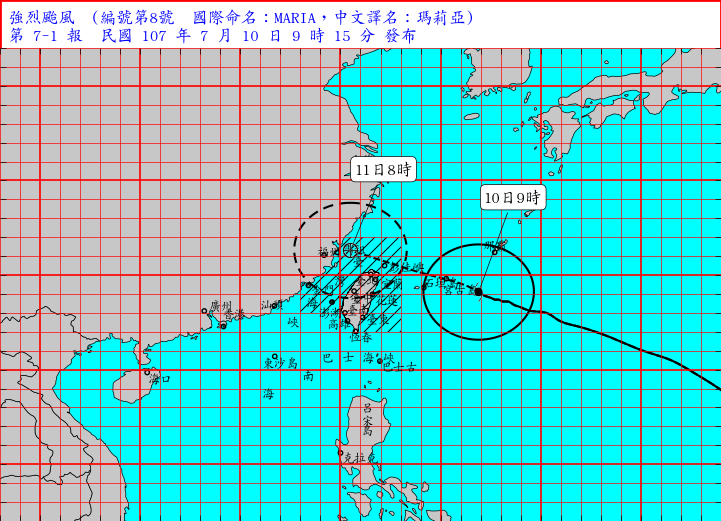 第八號颱風瑪莉亞今天早上 10 :00 的中心位置在北緯 24.3 度,東經 126.6 度,也就是宜蘭的東方約 490 公里海面上,以每小時28公里速度,向西北西進行。中心氣壓 920 百帕,近中心最大風速每秒 53 公尺(約每小時 191 公里),相當於 16 級風,瞬間最大陣風每秒 65 公尺(約每小時 234 公里),相當於 17 級風以上,七級風暴風半徑 280 公里,十級風暴風半徑 100 公里。預測 11 日 8 時的中心位置在北緯 26.3 度,東經 120.5 度,即在基隆的西北方約 180 公里之海面上。