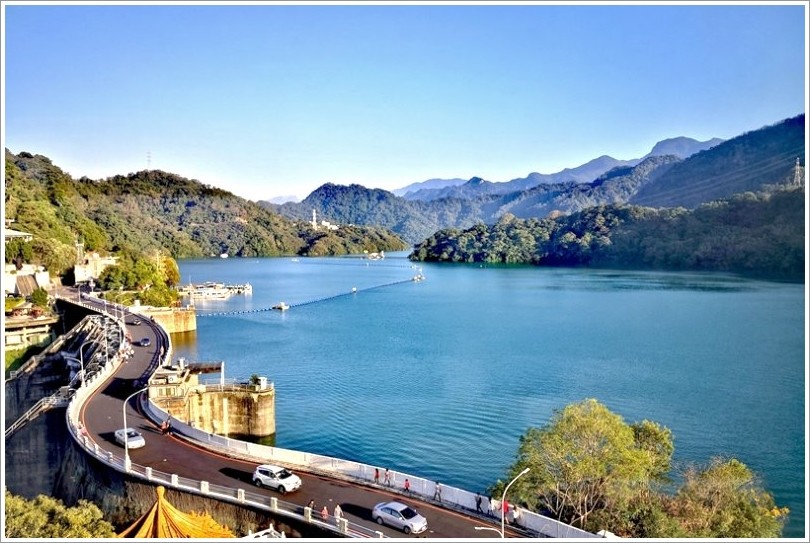 ▼一望無際的湖光山色加上蜿蜒的道路,怎麼拍都很美!想要欣賞到壩頂的風光,得先從坪林收費站進來,再將車子停在石門勝景或是附近車格,再走過去嵩台即可!