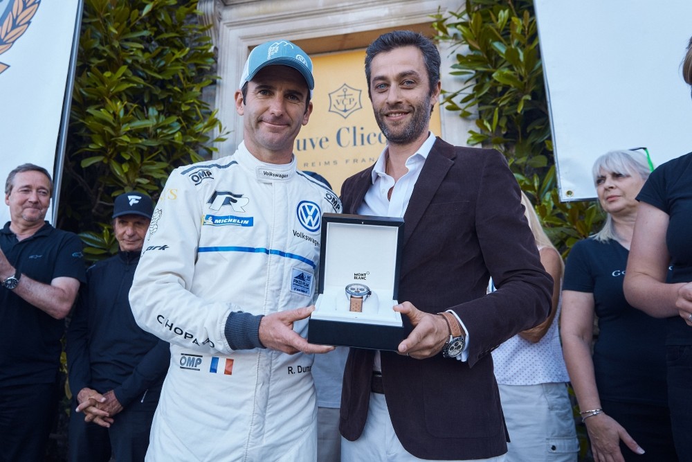 (右)萬寶龍行銷部執行副總裁Vincent Montalescot頒贈獎項給本屆爬坡賽冠軍Romain Dumas。