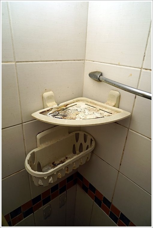 ▼放洗髮精、沐浴乳的地方,也是積了厚厚一層汙垢!