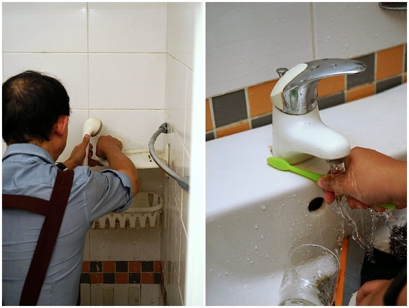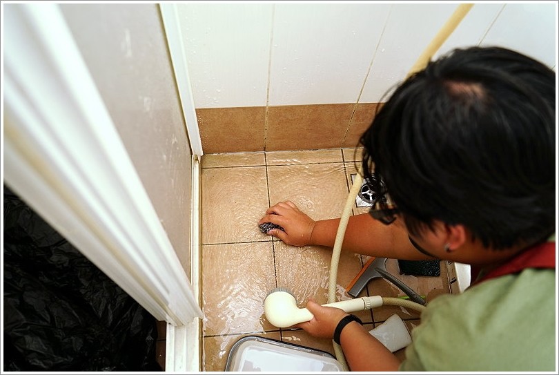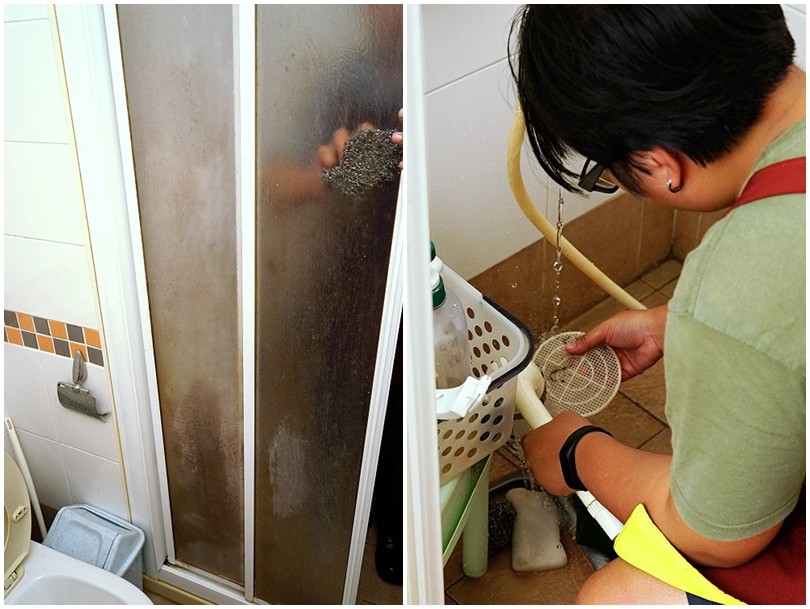 ▼淋浴拉門竟然拿出不銹鋼球來刷洗啦~可見這裡的陳年汙垢不是蓋的,但他們也會盡量想辦法清潔就是了!而且連排水孔上蓋的濾網也會認真刷洗,真是太佩服了!