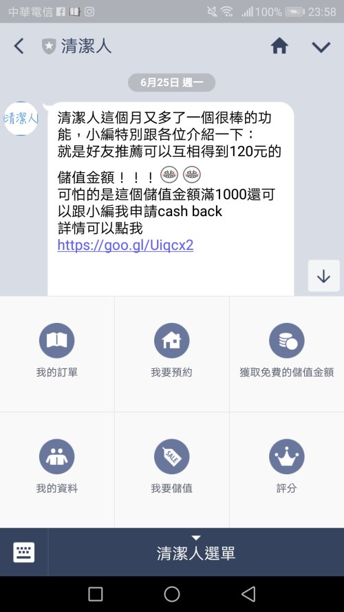 ▼重點還有獲得免費儲值金額的部份,只要邀請好友來體驗「清潔人」,就能獲得120元儲值金,好友也可以立即獲得120元抵用金,重點是還可以立即使用唷!沒有人推薦的話也無所謂,直接輸入公司的手機號碼:0966775299一樣也可以獲得120元儲值金,真的很佛心!且如果你的儲值金額超過一千,也可以直接申請Cash Back就能退款現金到你的銀行帳戶,真的很實用!有需要的朋友也可以點選詳情了解一下!