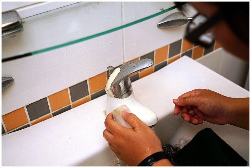 ▼連水龍頭的周邊、外圍也都用科技棉來仔細刷洗!
