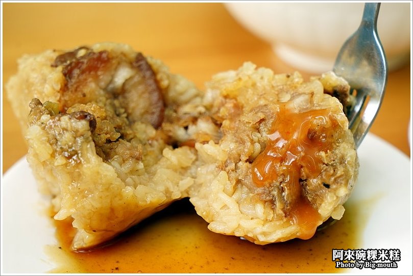 ▼黏Q的糯米裡頭包裹著豬肉、香菇、花生等配料,吃起來口感Q彈又有香氣,搭配醬料更提味不少!
