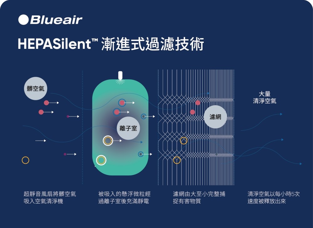 (Blueair系列產品使用HEPASilentTM過濾技術,更能有效捕捉細小懸浮微粒)