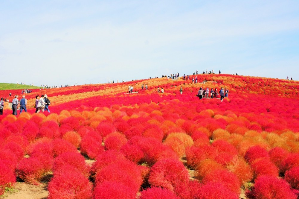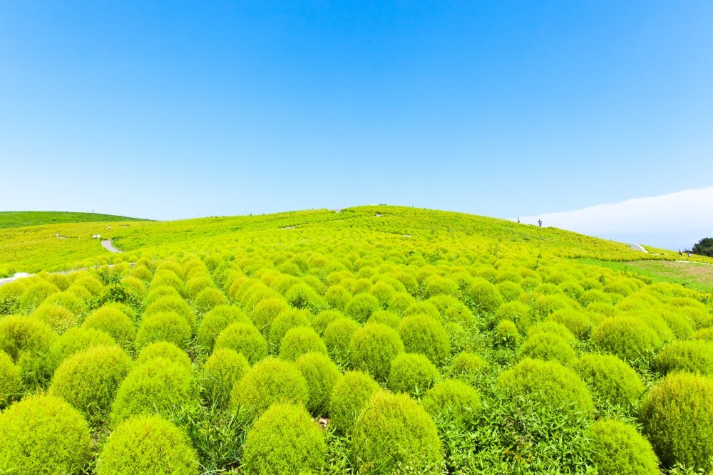 東京近郊的茨城國營常陸海濱公園,有個可愛度破表的超人氣景點─掃帚草!掃帚草,又名地膚,花語是「夫婦圓滿」。常陸海濱公園種了 3 萬多棵的掃帚草,從帅苗的清爽,小小綠綠到長成一顆圓呼呼的球狀,整個「みはらしの丘」(見晴之丘)呈現的一片迷人的綠顏色,形成一片很舒服的綠毯。小綠掃帚草 8 月底會長到 90 公分左右,搭配湛藍的大海、清澈的天空,交織出一幅夏日的清爽美景,到了 9 月底,小綠就會慢慢變成小紅。