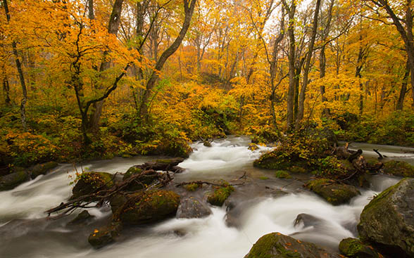來到了東北地區,就一定要介紹素有「天下第一美溪」、「賞楓最佳名所」之稱的奧入瀨溪!奧入瀨溪流長約 14 公里。蒼鬱茂密的大樹、大大小小的各式精采瀑布、水面上的蘚苔和藤蔓纏繞的岩石,美不勝收,女孩們在這裡拍照,最能襯托出空靈的氣質美。