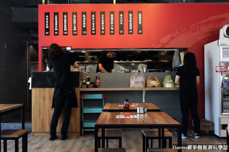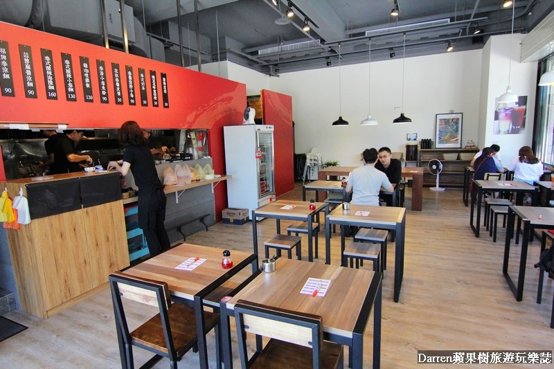 營造出線條簡潔的輕工業形象,在出餐區使用鮮明紅色來跳色帶些許活潑元素,座位桌間距離寬敞動線很流暢