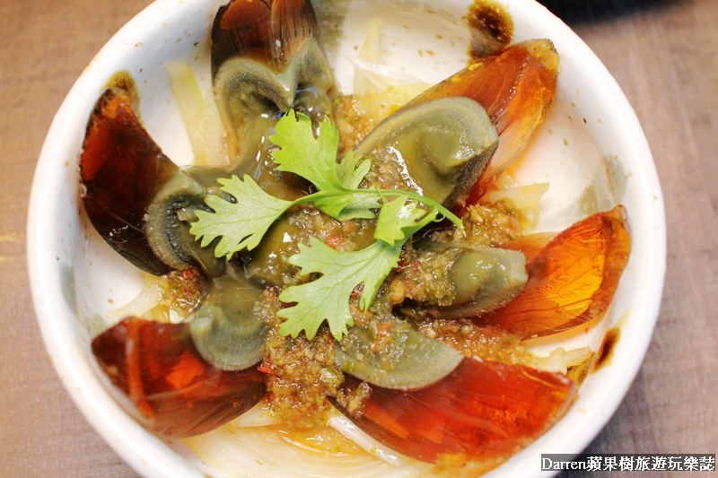 主廚創意料理花椒泰醬皮蛋,把台灣特有的皮蛋跟泰式醬汁來結合,有濃濃花椒香氣,酸酸辣辣的醬汁很棒