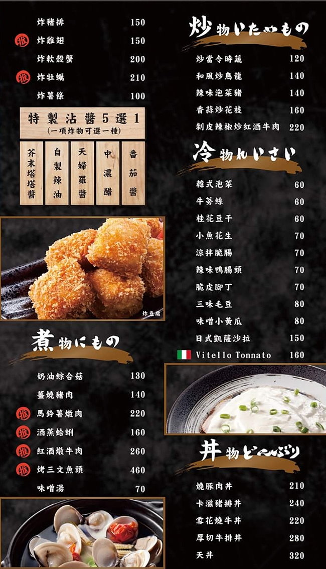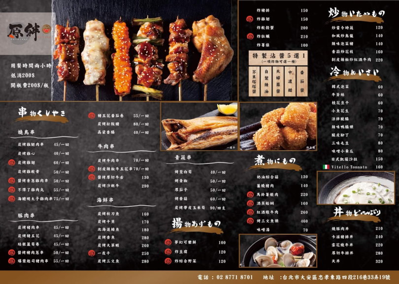 ▼菜單,這裡以串燒為主,搭配煮物、炒物、炸物、冷物及丼飯,想吃飽、吃巧都沒問題!