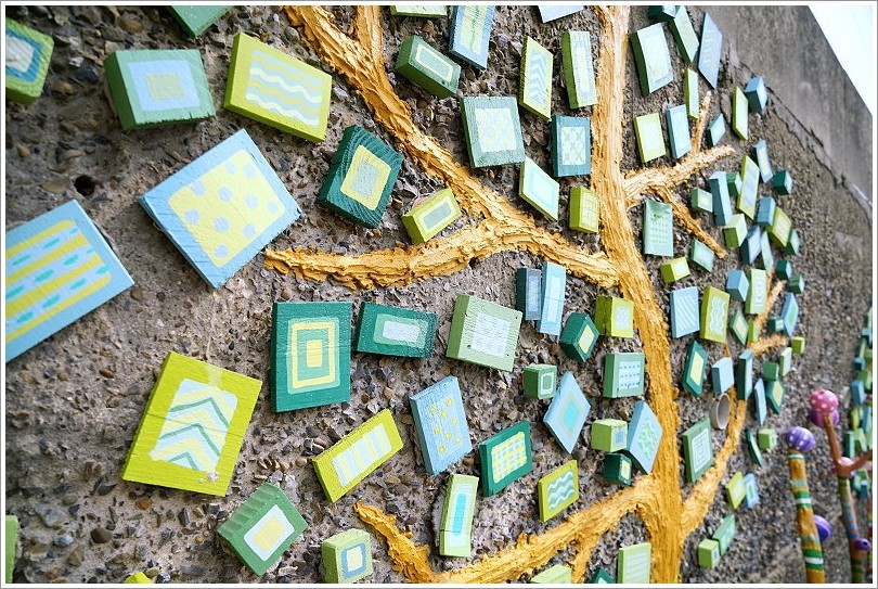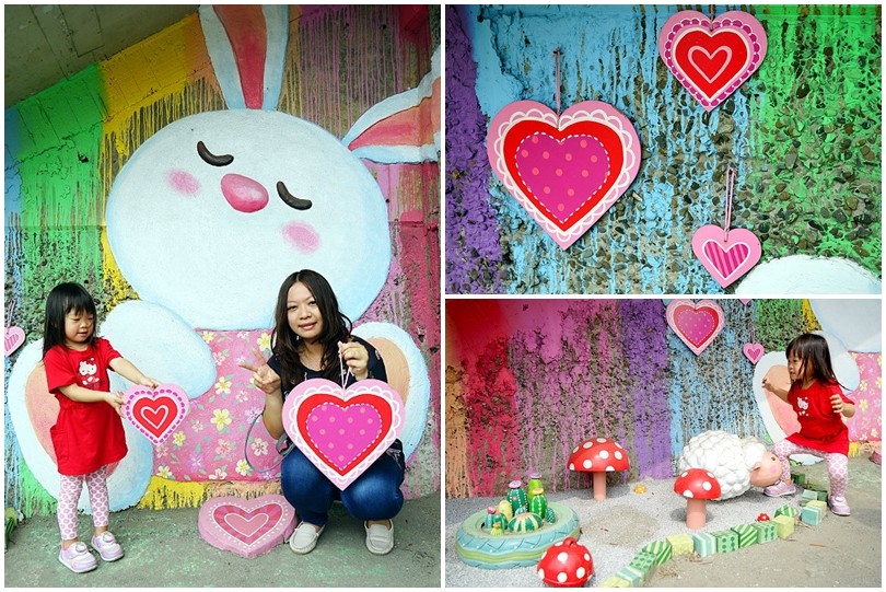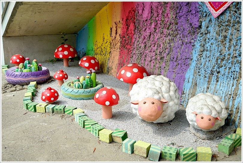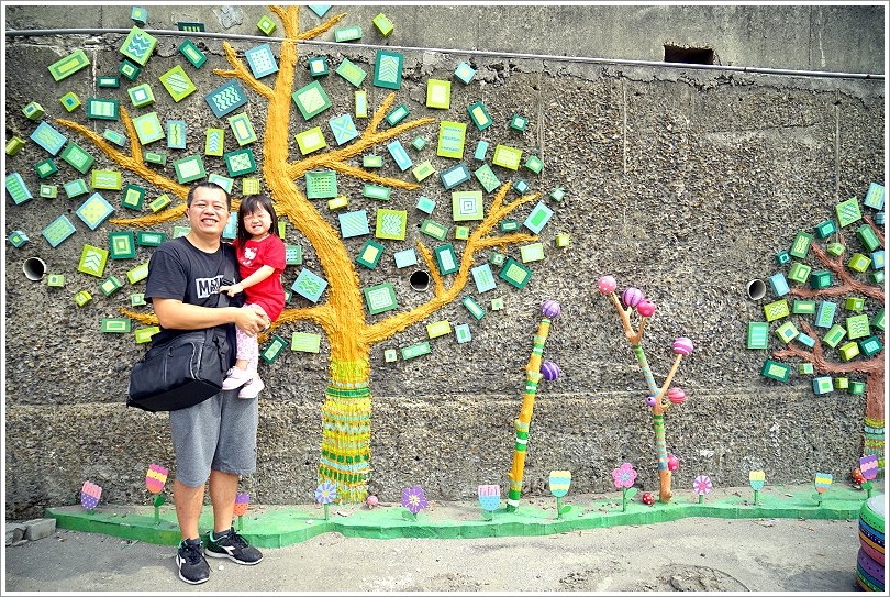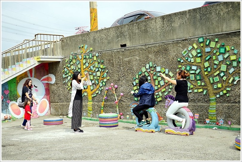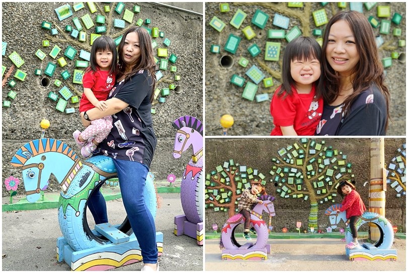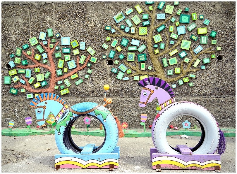 ▼接著我們又來到彩繪牆這裡玩耍啦!這裡其實是由附近一位虔誠的企業主贊助,由一個生活藝術創作者所發心設計的,利用很多廢棄或是用不到的材料來妝點成可愛又童趣的模樣!像是這兩隻馬就是採用輪胎搭配木材來製作,非常鮮艷又好拍,重點是還可以騎上去呢!