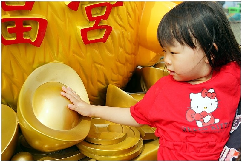 ▼小口愛還不忘摸摸金雞母身旁的金元寶,感覺很好奇的模樣!只能說小口愛真是太有天份啦~多摸一點XD