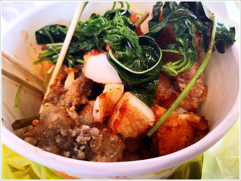 ▼我們買了炸物來享用,像我們一樣有選擇困難的朋友可以任選三樣才100元,其實滿划算的!炸花枝非常柔軟鮮美,連小口愛都吃得津津有味,連牙口不好的長輩也可以享用!另外還有炸蚵仔及鹹酥雞,每一樣都好新鮮好好吃,有來玩耍的朋友別錯過啦!