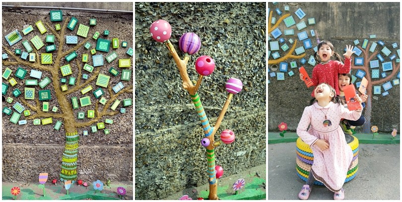 ▼小圓球則是採用海邊常見的浮球所做成,真的完全看不出來是廢棄物啊!這片彩繪牆讓小朋友玩得好開心,笑容就是最好的回饋啦!
