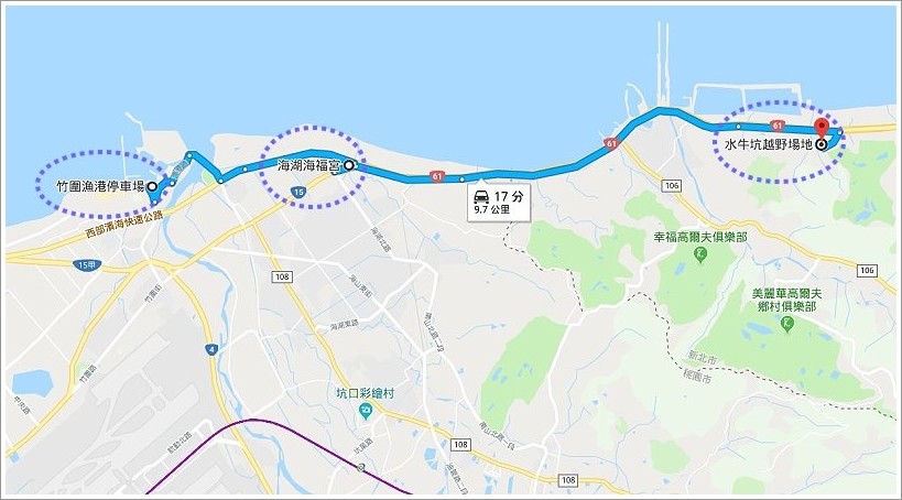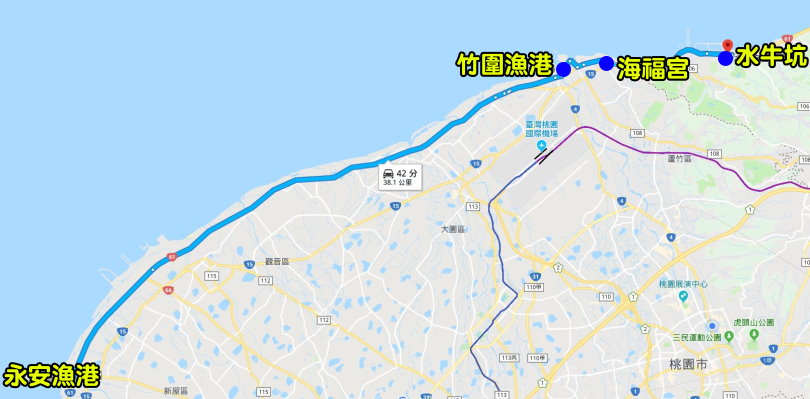▼這次大口要帶大家去的景點都很順路,沿著西部濱海快速道路開都可以抵達,就可以一次暢遊四個景點啦!如果覺得永安漁港太遠也可以先去竹圍漁港,車程通通都在17分鐘內,有時間的話再去永安漁港也可以!