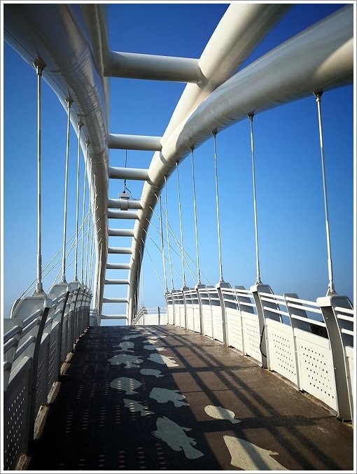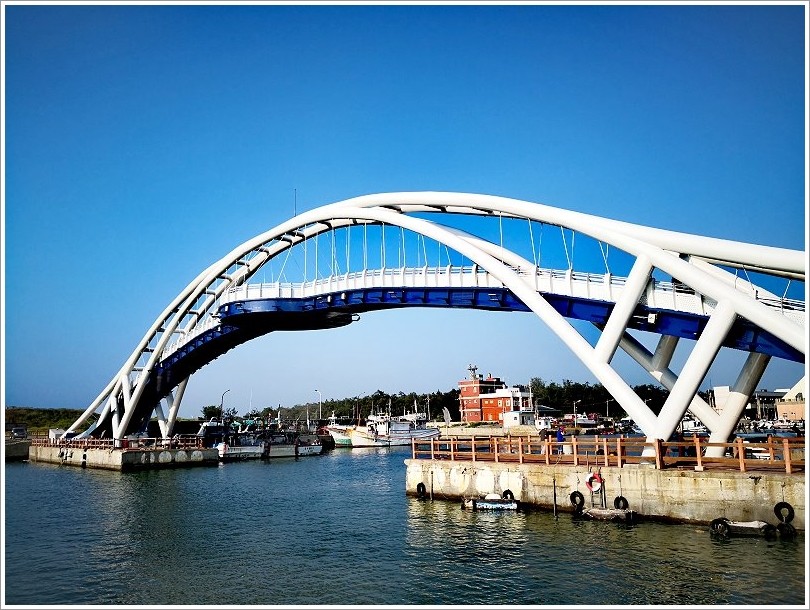 ▼全長120公尺的觀海橋結合藍衫與灰白元素,更凸顯全國首座的客家漁港的特色,在藍天的映襯下顯得更美麗啦!