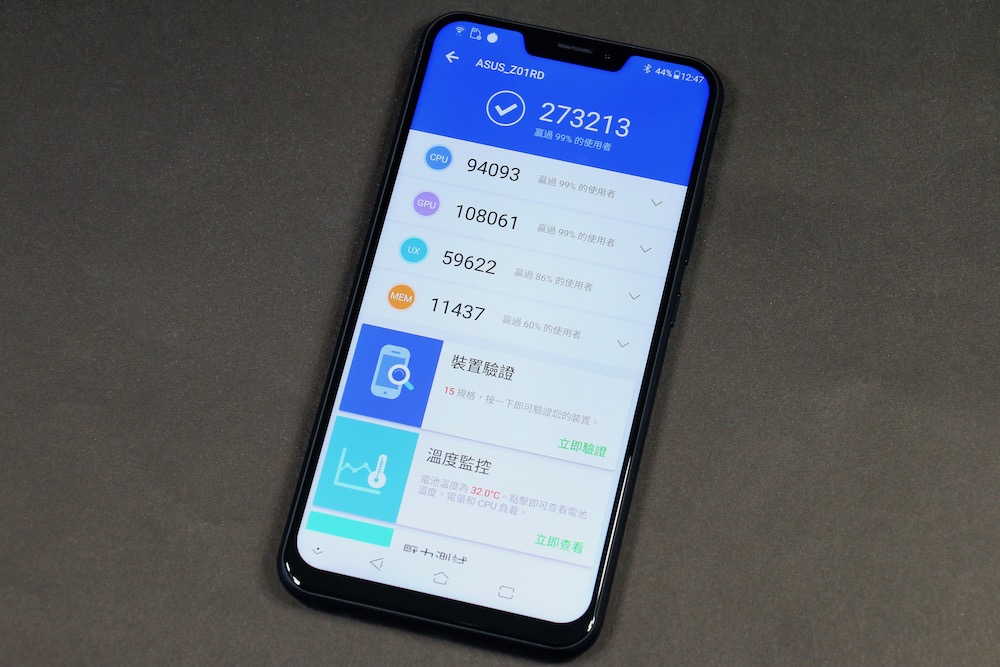 一般配備高通 Snapdragon 845 處理器的手機,平均分數大約落在 26 萬分左右,而配備相同處理器的 ZenFone 5Z,還可透過能有效提升效能的 AI 智慧效能技術,以及 OptiFlex 3.0 加速技術,讓效能表現更加優異。在 AI 智慧效能開啟後,ZenFone 5Z 的實測效能成績為 273,213 分,效能表現比一般配備相同處理器的手機還好,也證明了 AI 智慧效能技術確實能有效提升它的運算速度,適時的給予最快速的運算效能。