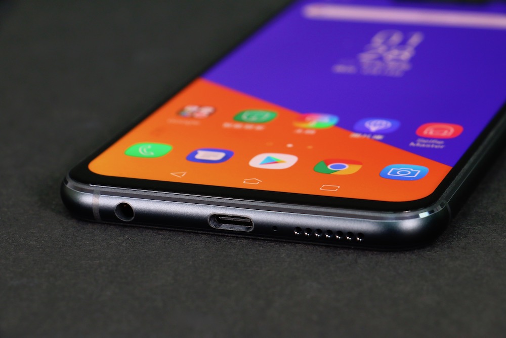 機身底部由左至右依序是 3.5mm 耳機孔、USB Type-C、降噪麥克風、喇叭。值得一提的是,3.5mm 耳機孔支援 DTS Headphone:X 7.1 聲道虛擬環繞音效以及 24 位元 / 192kHz (4 倍 CD 音質) ,接上盒裝內附贈的 ZenEar Pro 就能享有高音質體驗。另外,若想要將音樂外放,最右側的喇叭支援音量增強 46% 以及內建 NXP 9874 擴大器晶片的增強型五磁鐵立體聲揚聲器,可確保外放音效清晰動聽。