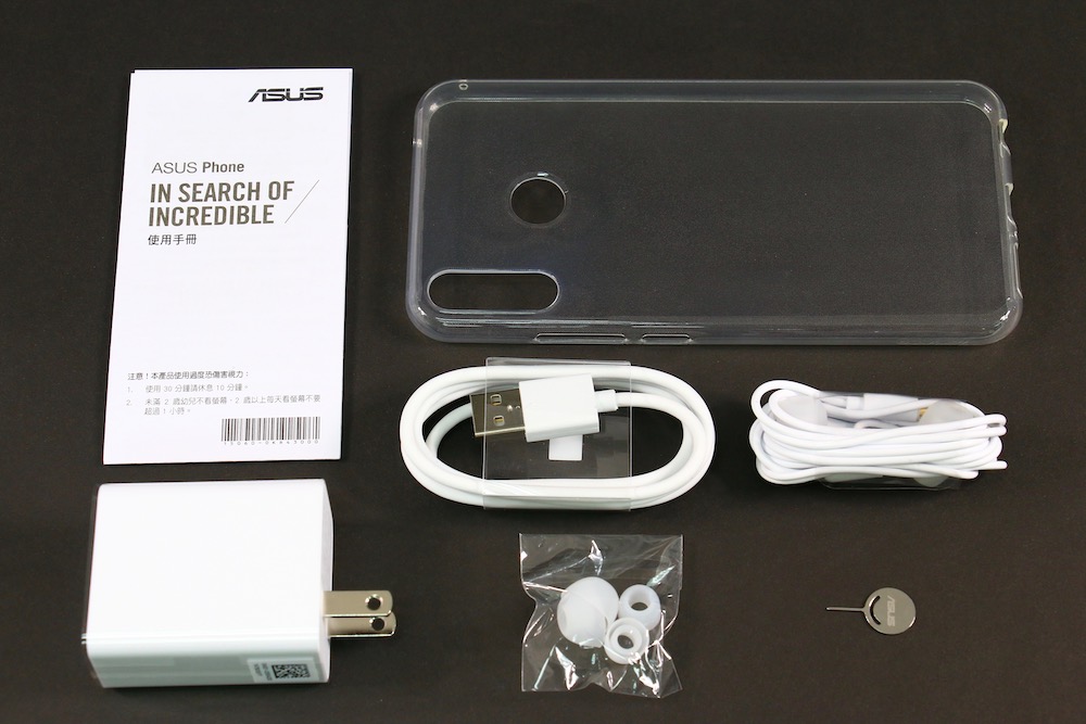 盒裝配件一覽,由左至右依序是數份使用手冊、透明軟質保護套、9V / 2A 充電器、充電線、耳塞,以及一條支援 Hi-Res 的 ZenEar Pro 耳機與 SIM 卡針。值得一提的是,支援 9V / 2A 快速充電的 ZenFone 5Z,還可以透過非 ASUS 快充變壓器進行快速充電,讓使用者可以更加便利。