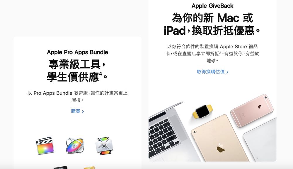 Apple 返校日(Back to school)來了,這次同樣為學生與教職員推出許多優惠的 Apple 商品,包括有 MacBook / MacBook Air / MacBook Pro / iMac / iMac Pro / Mac Pro 以及 iPad 系列等商品,甚是還能用學生價購買專業級工具或是用現有符合條件的裝置在直營店享有立即折抵新品的機會。